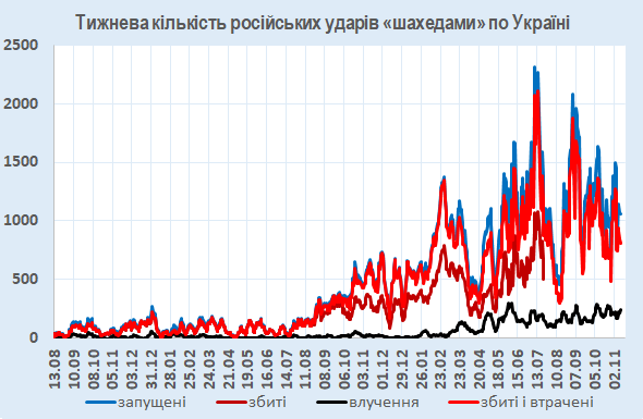 За минулі сім днів було збито чи локаційно втрачено 808 із 1056 запущених по Україні БпЛА (разом – 77%).