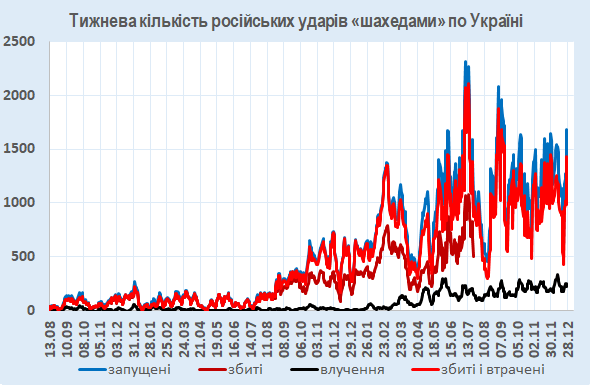 За минулі сім днів було збито чи локаційно втрачено 1433 із 1683 запущених по Україні БпЛА (разом – 85%).