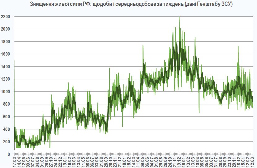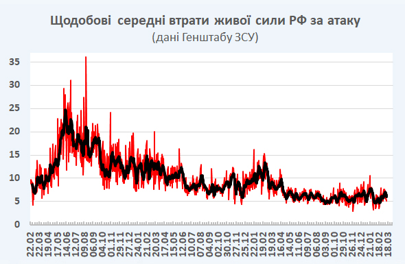 12:10 За минулий тиждень, за зведеннями Генштабу ЗСУ, було відбито 976 російських атак (позаминулого тижня – 964), при цьому знищено 5880 російських військових (позаминулого – 6520): у середньому 6,0 за атаку (позаминулого – 6,8).