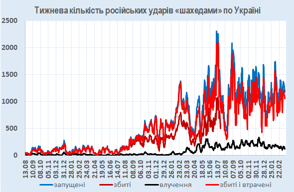 За минулі сім днів було збито чи локаційно втрачено 1059 із 1180 запущених по Україні БпЛА (разом – 90%).
