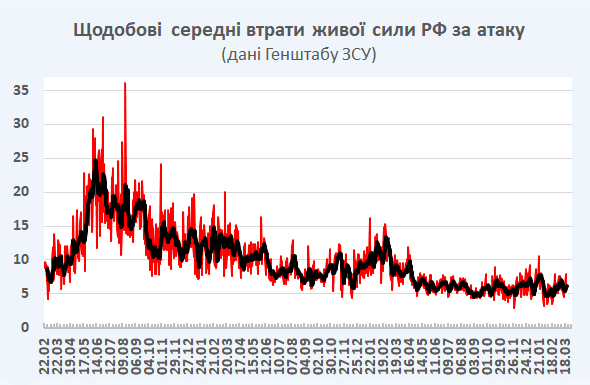 12:00 За минулий тиждень, за зведеннями Генштабу ЗСУ, було відбито 1409 російських атак (позаминулого тижня – 976), при цьому знищено 8710 російських військових (позаминулого – 5880): у середньому 6,2 за атаку (позаминулого – 6,0).